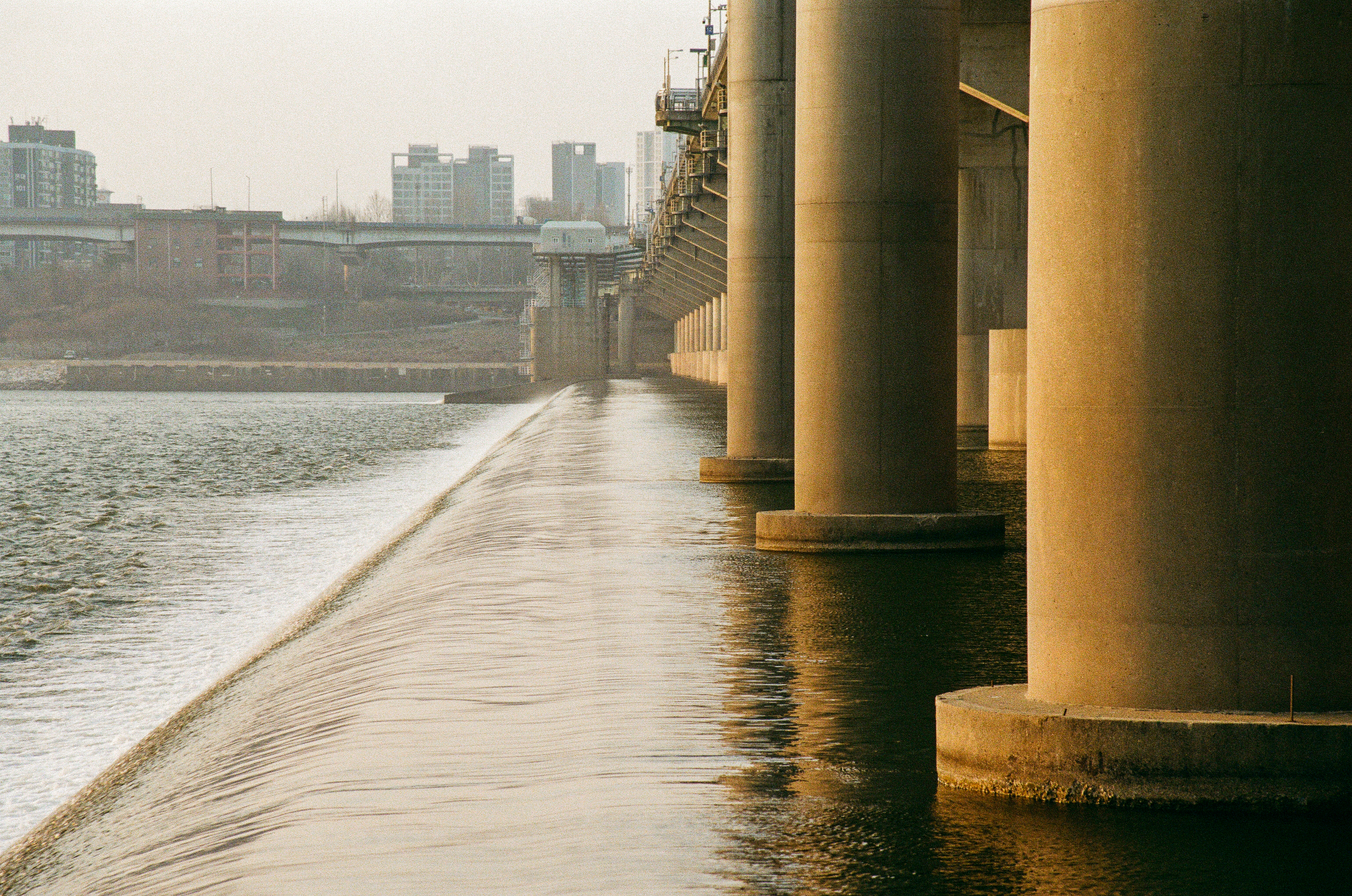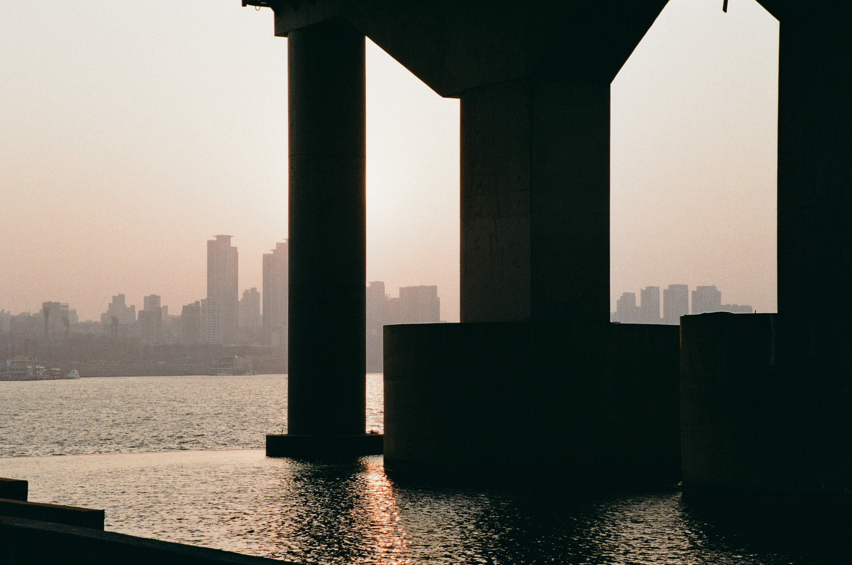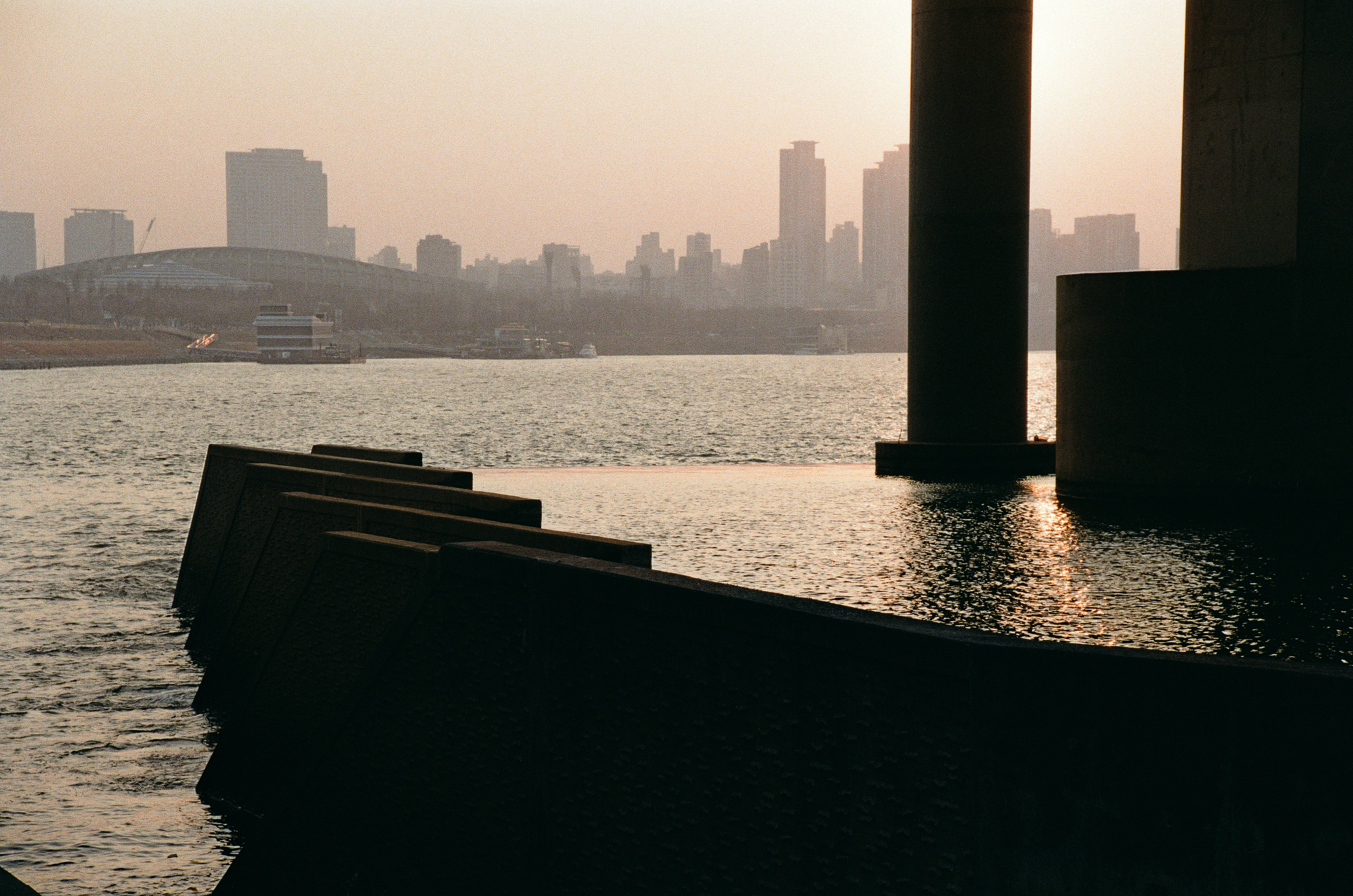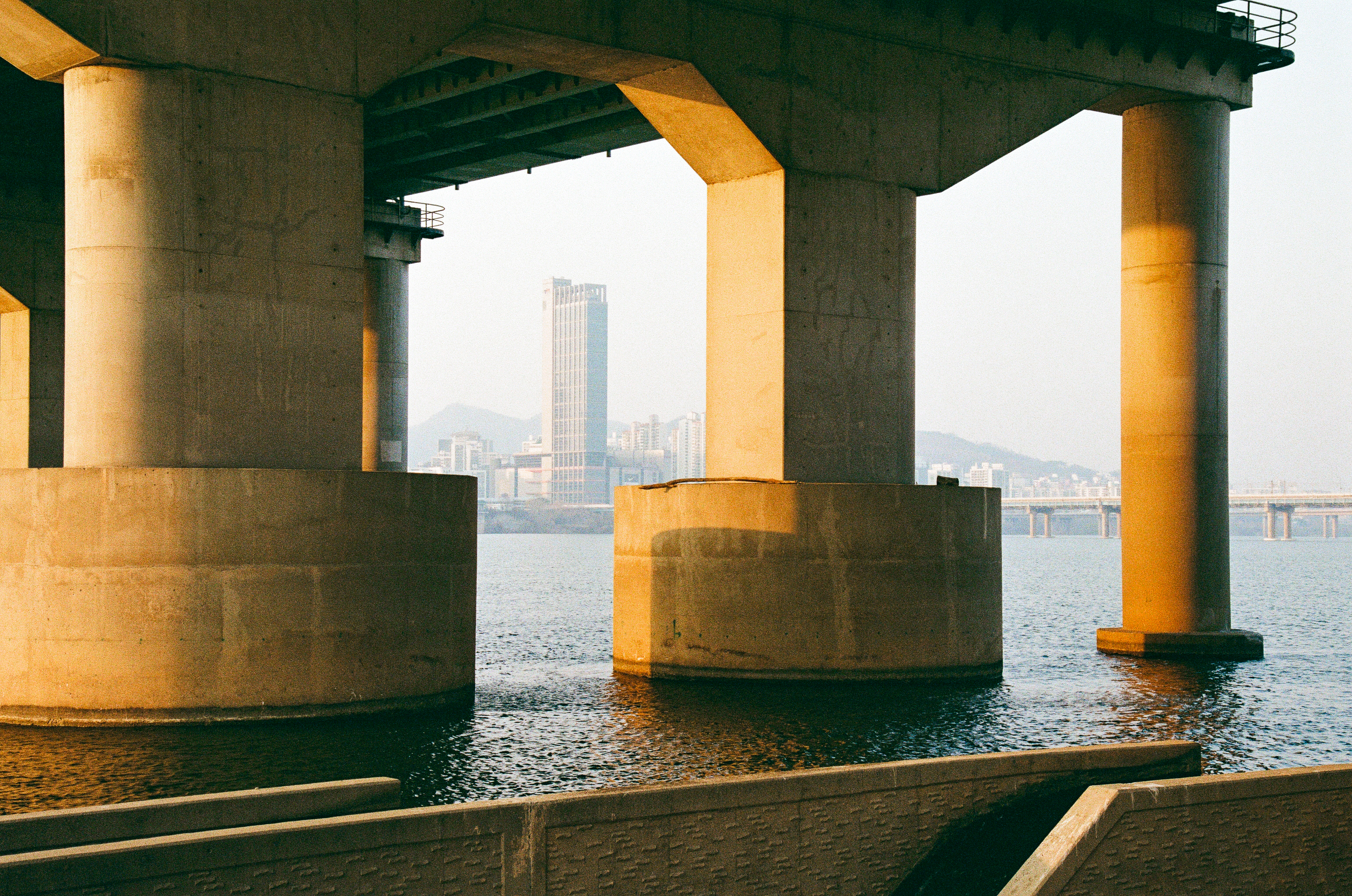 첫째는 수동 카메라를 들고 왔어야 한다. 워낙 미세먼지가 심했던 날이기도 하지만 노을빛이 떨어지는 다리 기둥의 모습과 뒤에 보이는 철교의 모습이 조화롭지가 못하다, 초점과 노출의 의도적 사진을 위해 수동 카메라를 들고 와야겠다.